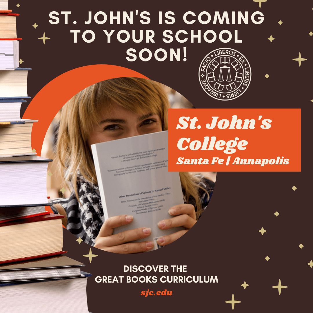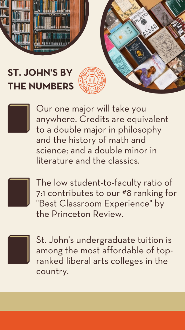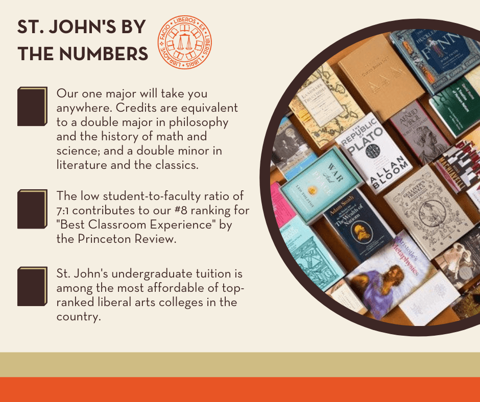 St. John’s College, and our iconic great books curriculum, is radically different. Our students, known as Johnnies, pursue a common curriculum where they read the great books and participate in small, discussion-based classes of 20 students or fewer. Instead of having majors and textbooks, Johnnies take interdisciplinary classes that explore ideas in philosophy, literature, math, science, music, language, politics, and more. St. John’s is known as the most rigorously intellectual college in the country, engaging great authors from Plato to Shakespeare, Cervantes, Newton, Austen, Darwin, Einstein, Woolf, and Du Bois—to name a few.