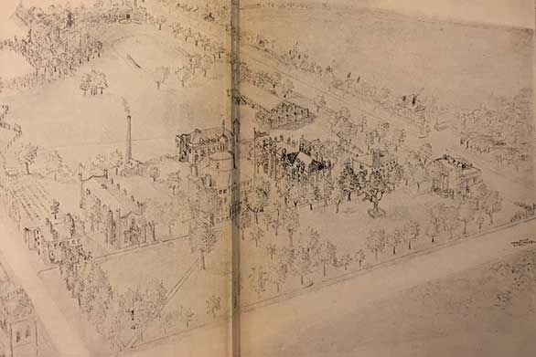 This illustration is from the inside cover of the 1934 Rat-Tat yearbook, where Mark Smith drew an aerial view of the Annapolis campus. Clearly visible among the buildings are (from left to right): Paca-Carroll (1857), Humphreys Hall (1837), McDowell Hall (1742), Pinkney Hall (1858), Chase-Stone (1857), and the Barr-Buchanan Center (1899). Back then, the Barr-Buchanan Center was called Woodward Hall and served as the college’s library. Randall Hall (1903) sits behind McDowell and Pinkney, while Iglehart (1910) is situated on back campus.
