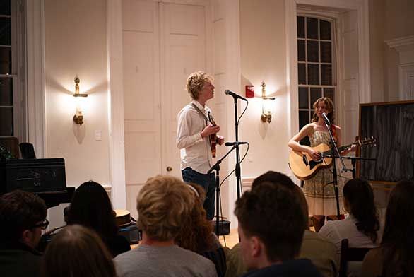 This shared musical understanding quickly became central to Summerfield’s sound, and by sophomore year, playing together was a regular occurrence. Wagner recalls one evening on the top floor of Pinkney Hall, two floors above the dorm room where Jac Holzman (Class of 1952) founded Elektra Records, when a group of friends gathered along the stairs with pizza in hand. She picked up her guitar, and Thorne-Thomsen joined in on the banjo; soon, everyone was singing along to old folk songs. “We’ve had lots of moments like this,” she says, “but I just remember this specific one.”